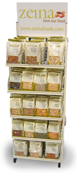 We have worked closely with one of our valued customers Zeina Foods for a number of years. As a premium nut supplier Zeina Foods approached Tube & Wire Display in 2008 with a specific requirement for one of their Cash & Carry customers. Their brief was to design a stand suitable for displaying their nut product packs that would have maximum consumer impact but would also be robust. Another critical factor was the requirement for the stands to be mobile so that they could be easily moved and positioned in various locations throughout the store. The stands also needed to take up limited footprint given the limited space restrictions in many of the cash and carry stores.